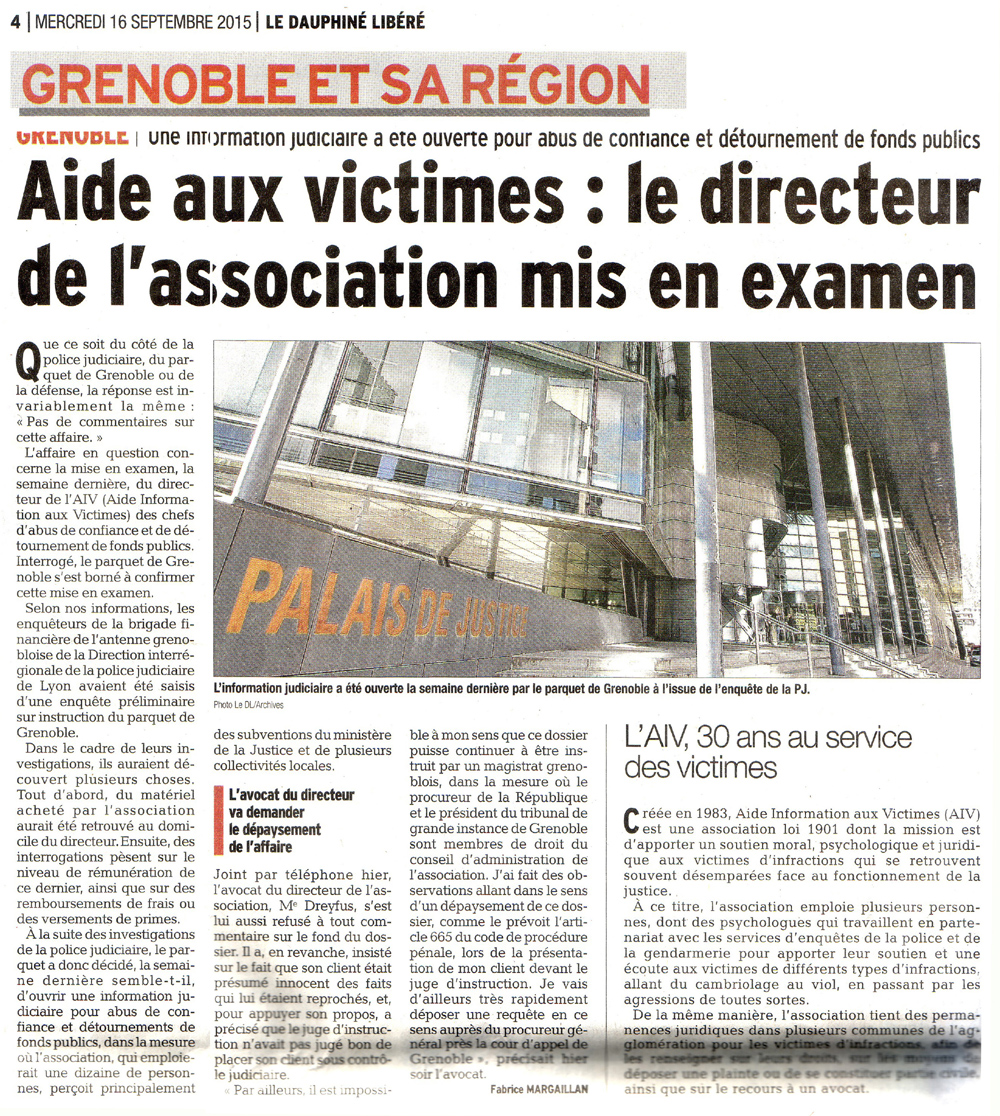 Grenoble, association d'aide aux victimes (AIV) - 16 septembre 2015 Détournement de fonds publics ! ! ! Indépendance ! Financée par le budget de la justice (!) (copinage) il n'est pas surprenant que cette association ait refusé d'aider René FORNEY contre les dérives du milieu du droit !