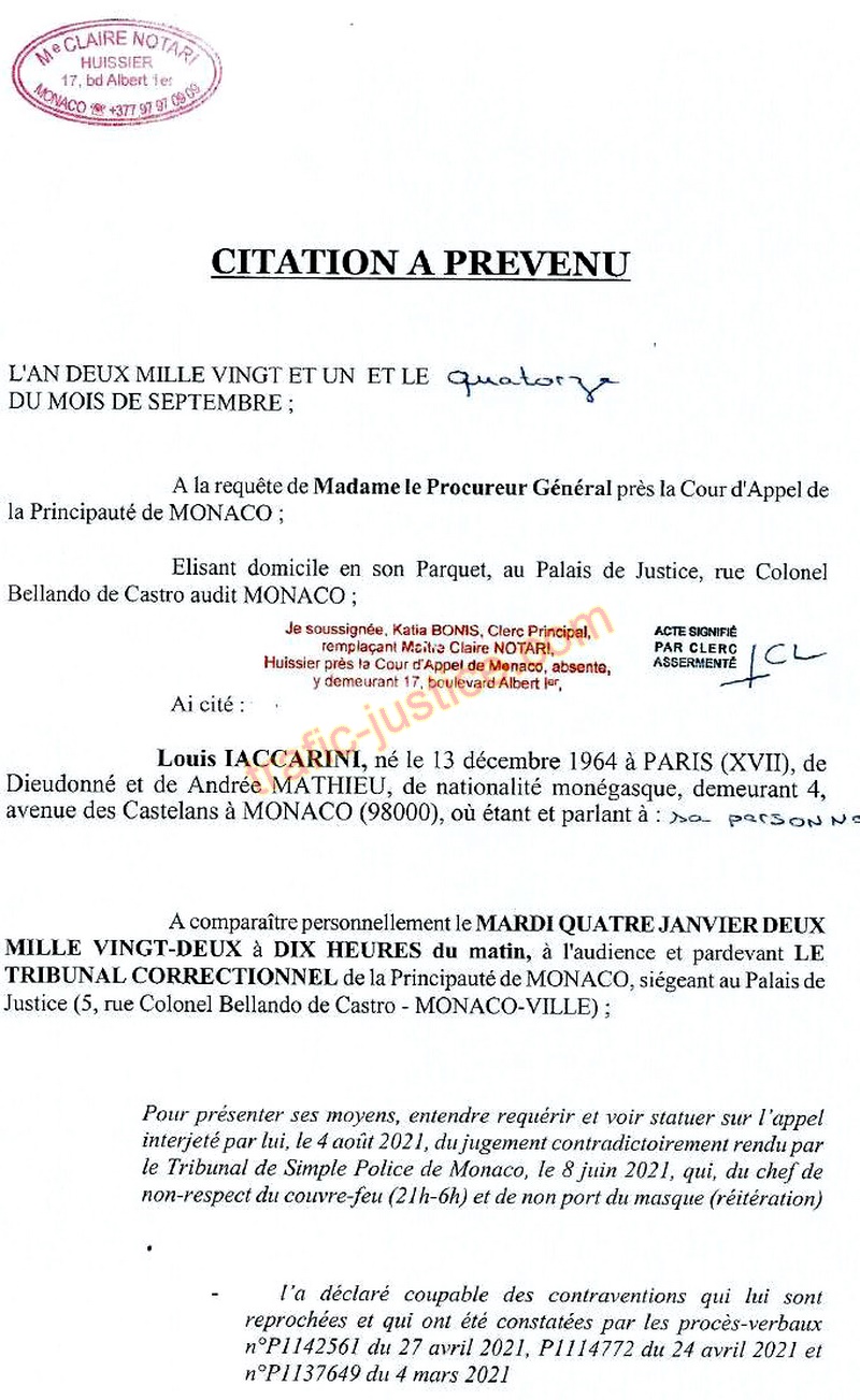 Louis IACCARINI, né le 13 décembre 1964 à PARIS (XVII), de Dieudonné et de Andrée MATHIEU, de nationalité monégasque. demeurant 4, avenue des Castelans à MONACO (98000), où étant et parlant à : sa personne