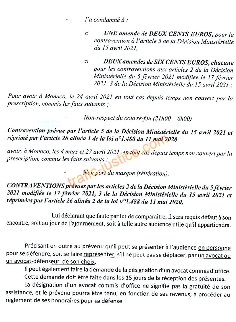 CONTRAVENTIONS prévues par les articles 2 de la Décision Ministérielle du 5 février 2021 modifiée le 17 février 2021, 3 de la Décision Ministérielle du 15 avril 2021 et réprimées par l'article 26 alinéa 2 de la loi n°1.488 (la 11 niai 2020,