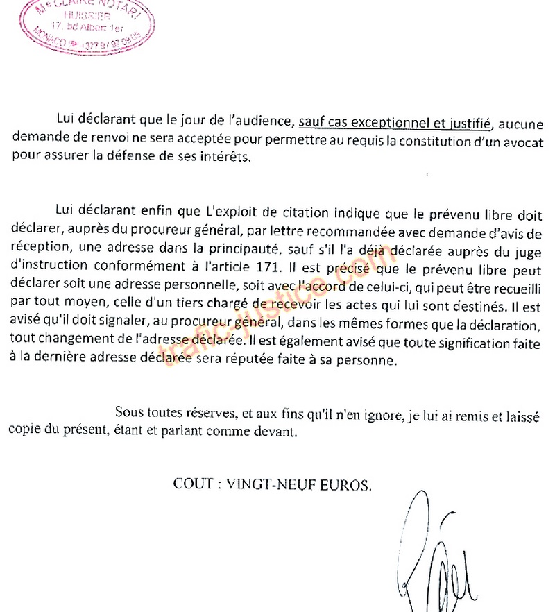 Lui déclarant enfin que L'exploit de citation indique que le prévenu libre doit déclarer, auprès du procureur général, par lettre recommandée avec demande d'avis de réception, une adresse dans la principauté, sauf s'il l'a déjà déclarée auprès du juge d'instruction conformément à l'article 171. Il est précisé que le prévenu libre peut déclarer soit une adresse personnelle, soit avec l'accord de celui-ci, qui peut être recueilli partout moyen, celle d'un tiers chargé de recevoir les actes qui lui sont destinés. Il est avisé qu'il doit signaler, au procureur général, dans les mêmes formes que la déclaration, tout changement de l'adresse déclarée. Il est également avisé que toute signification faite à la dernière adresse déclarée sera réputée faite à sa personne.