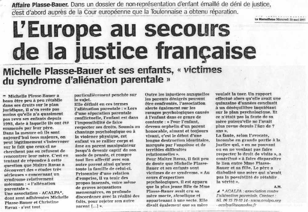 Une affaire où les intérêts de l'enfant sont bafoués comme pour des millions de pères et de mères en France Source : La Marseillaise du mercredi 30 mai 2007 par AGNES MASSEZ - la suite (Voir aussi article de Var-matin, et site Internet ) |