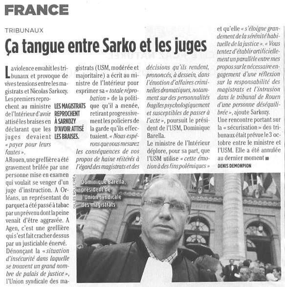 "La violence envahit les tribunaux et provoque de vives tensions entre les magistrats et Nicolas Sarkozy ... juges devaient payer pour leurs fautes ... l'Union syndicale des magistrats (USM ... ministre de l'intérieur ... président de l'USM, Dominique BARELLA ... responsabilité des magistrats ... Sarkozy ..."