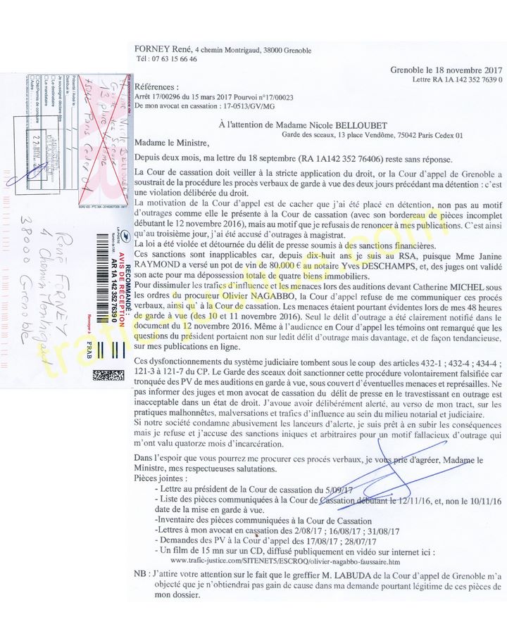 Ces dysfonctionnements du système judiciaire tombent sous le coup des articles 432-1 ; 432-4 ; 434-4 ; 121-3 à 121-7 du CP. Le Garde des sceaux doit sanctionner cette procédure volontairement falsifiée car tronquée des PV de mes auditions en garde à vue, sous couvert d'éventuelles menaces et représailles. Ne pas informer des juges et mon avocat de cassation du délit de presse en le travestissant en outrage est inacceptable dans un état de droit. J'avoue avoir délibérément alerté, au verso de mon tract, sur les pratiques malhonnêtes, malversations et trafics d'influence au sein du milieu notarial et judiciaire.