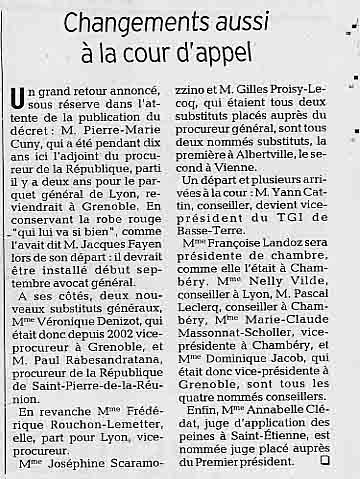 A ses côtés, deux nouveaux substituts généraux, Mme Véronique Denizot, qui était donc depuis 2002 vice procureur à Grenoble, et M. Paul Rabesandratana, procureur de la République de Saint-Pierre-de-la-Réunion.     En revanche Mme Frédérique Rouchon-Lemetter, elle, part pour Lyon, vice procureur.