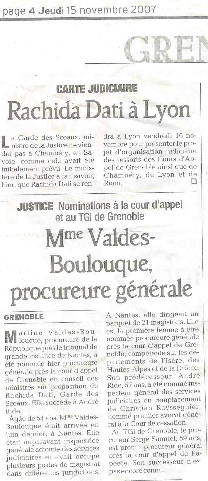| Photos et mouvements du /11/02 7/09/04 2/09/05 23/02/05 3/03/06 15 juillet 2006 Jean-Michel COUTIN 15/11/07 juin 2008 juillet 2008 janv.2009 nov.2009 janv.2010 TROP DE MAGISTRATS faussaires comme Jean-Michel Pretre de Nice 2017 ... 2024 Le D L jeudi 15 novembre 2007 : (Texte recopié avec liens ci-dessous) Cartes judiciaire Rachida Dati à Lyon... Justice Nominations à la cour d'appel de Grenoble... Mme Valdes-BOULOUQUE, procureure générale. ... procureure de la République près le tribunal de grande instance de Nantes, a été nommée hier procureure générale près la cour d'appel de Grenoble... Elle succède à André RIDE... compétente sur les départements de l'Isère, des Hautes-Alpes, et de la Drôme. Son prédécesseur, André Ride 57 ans, a été... |