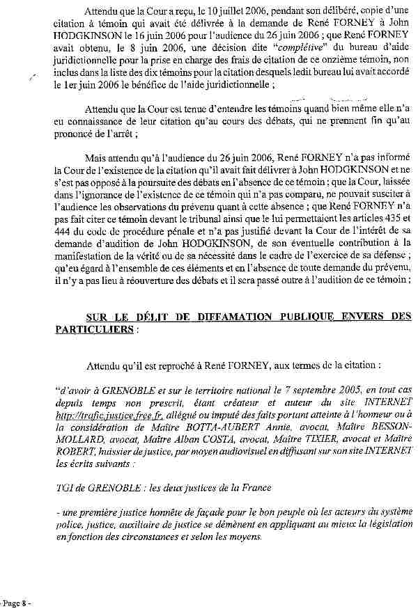 HODGKINSON le 16 juin 2006 pour l'audience du 26 juin 2006 ; que René FORNEY