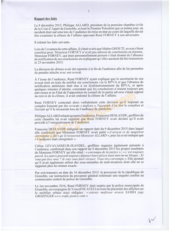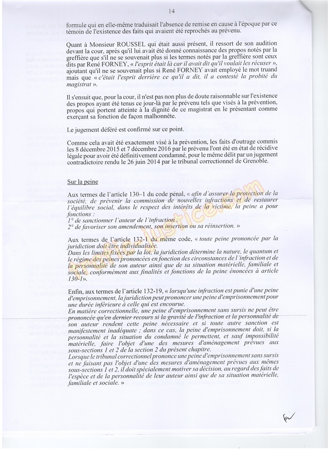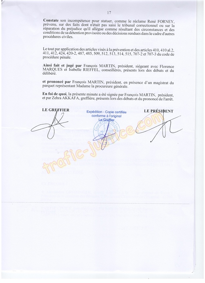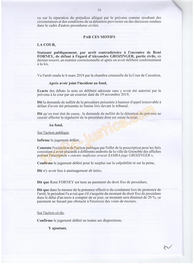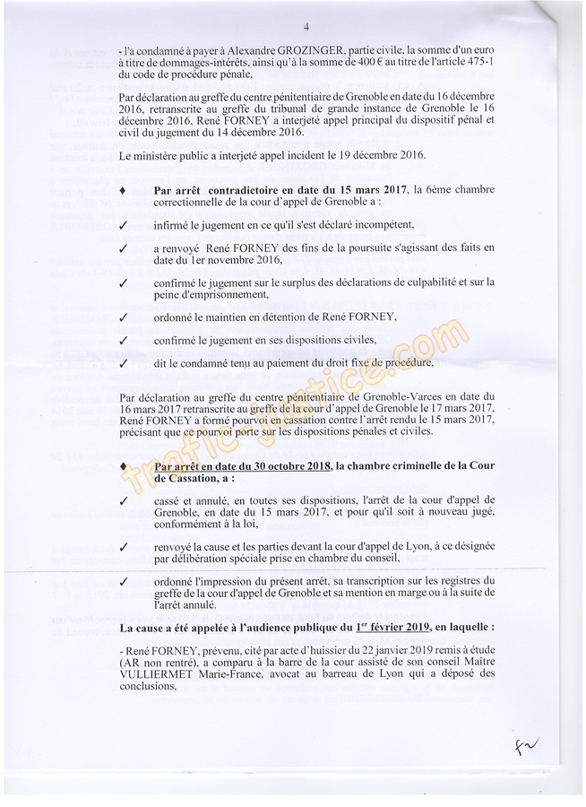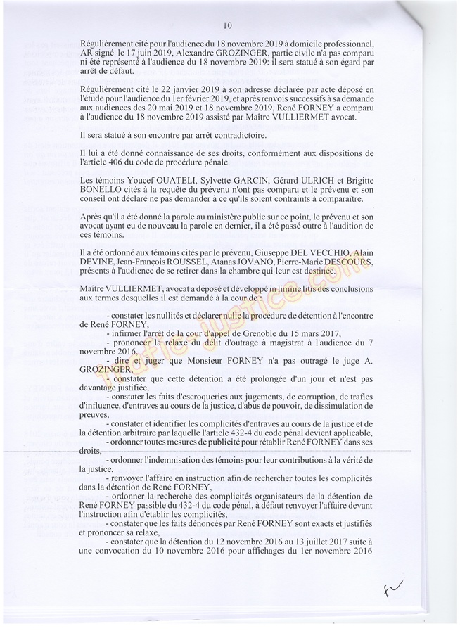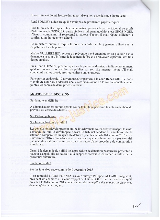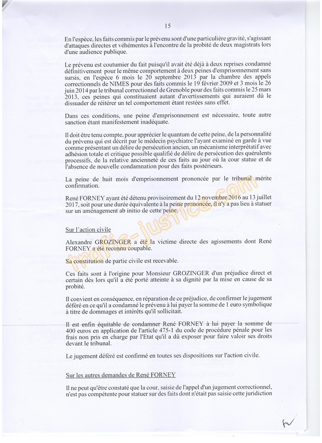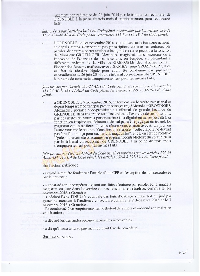 Les 2 juges mafieux protégés accusateurs d'outrages GROZINGER et ALLARD n'étaient ni présents ni représentés ni n'avaient produit des conclusions pour leur défense. Résultats un simulacre d'audience pour rejuger : Fausses accusations, faux PV de police, refus d'audition des témoins, non respect du code de procédure pénale (pas d'avocat, comparution immédiate pour du délit de presse, les mêmes juges du fond et des libertés JLD...) = 8 mois en détention arbitraire en 2016/2017 en récidive de 6 en 2014 - Après cassation les juges de Lyon (déjà intervenu pour un autres jugement) complices et corrompus avec leur avocat désigné confirme ci-dessous.