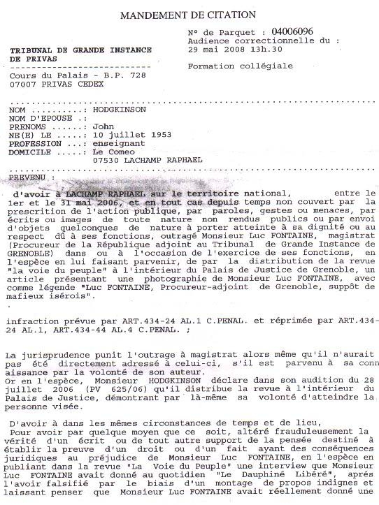 Rétorsions du juge FONTAINE Luc contre le journaliste HODGKINSON John de la voix du peuple assigné en 2008 suite à sa publication de février 2006 Pages 1 , 2 , 3 , 4 , 5 , 6 , 7 , 8 , 9 , 10 et Mai 2006
