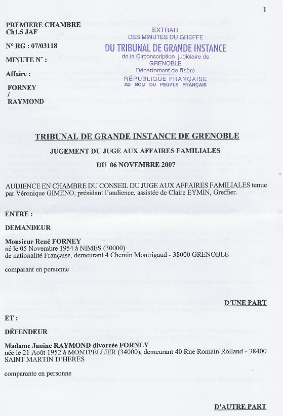 Malgré ma demande, ce jugement, du 6 novembre 2007, me dépossède de la demi part des loyers qui me revient. Il est rendu par le juge aux affaires familiales GIMENO Véronique.