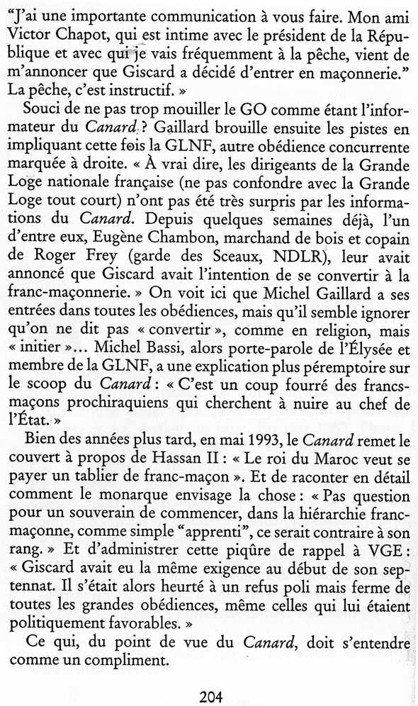 Souci de ne pas trop mouiller le GO comme étant l'informateur du Canard ? Gaillard brouille ensuite les pistes en impliquant cette fois la GLNF, autre obédience concurrente marquée à droite. « À vrai dire, les dirigeants de la Grande Loge nationale française (ne pas confondre avec la Grande Loge tout court) n'ont pas été très surpris par les informations du Canard. Depuis quelques semaines déjà, l'un d'entre eux, Eugène Chambon, marchand de bois et copain de Roger Frey (garde des Sceaux, NDLR), leur avait annoncé que Giscard avait l'intention de se convertir à la franc-maçonnerie. » On voit ici que Michel Gaillard a ses entrées dans toutes les obédiences, mais qu'il semble ignorer qu'on ne dit pas « convertir », comme en religion, mais « initier »... Michel Bassi, alors porte-parole de l'Élysée et membre de la GLNF, a une explication plus péremptoire sur le scoop du Canard : « C'est un coup fourré des francs maçons prochiraquiens qui cherchent à nuire au chef de l'État. » Bien des années plus tard, en mai 1993, le Canard remet le couvert à propos de Hassan II : « Le roi du Maroc veut se payer un tablier de franc-maçon ». Et de raconter en détail comment le monarque envisage la chose : « Pas question pour un souverain de commencer, dans la hiérarchie franc- maçonne, comme simple "apprenti", ce serait contraire à son rang. » Et d'administrer cette piqûre de rappel à VGE : |
