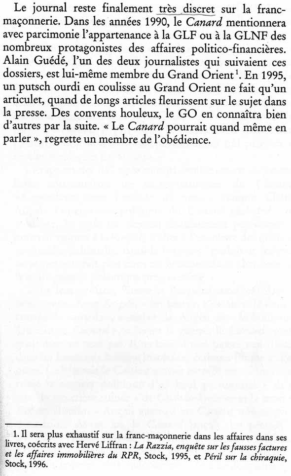 1. II sera plus exhaustif sur la franc-maçonnerie dans les affaires dans ses livres, coécrits avec Hervé Liffran : La Razzia, enquête sur les fausses factures et les affaires immobilières du RPR, Stock, 1995, et Péril sur la chiraquie, Stock, 1996. |