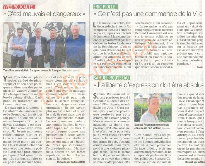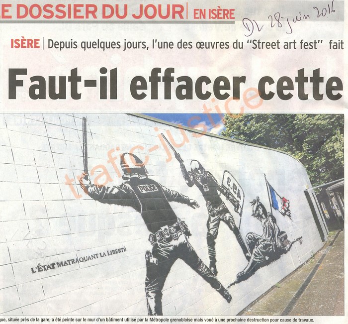 pour dire tout et n'importe quoi. Surtout que cette fresque est installée dans le périmètre de la gare de Grenoble, lieu de départ de manifestations qui ont souvent débordé. La liberté artistique est une chose, mais la liberté d'être intelligent peut aussi exister pour les artistes et ceux qui les subventionnent. » « Mais je fais la part des choses entre un artiste engagé en anonyme et l'immense majorité silencieuse, qui, comme l'a montré un récent sondage, soutient les forces de l'ordre. De plus en plus de personnes viennent nous voir pour nous témoigner de leur soutien», conclut Patrick Mairesse. Des preuves d'affection qui sont même arrivées par des appels au "17"... Benoît BOUY |