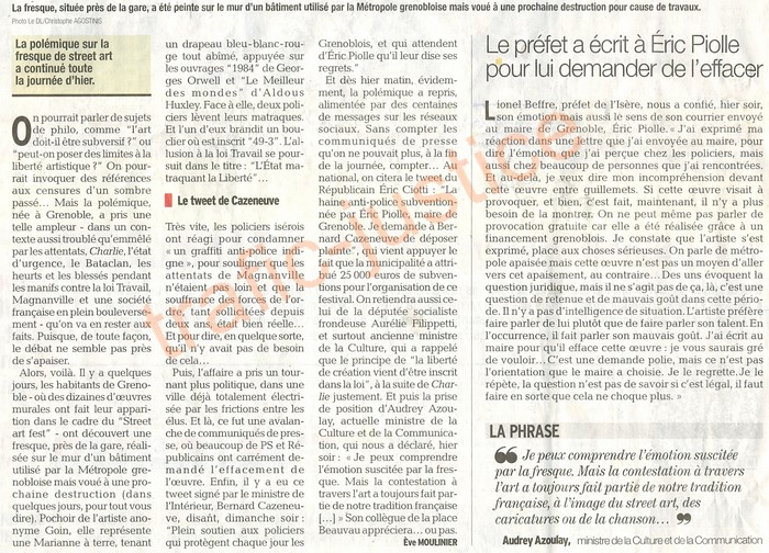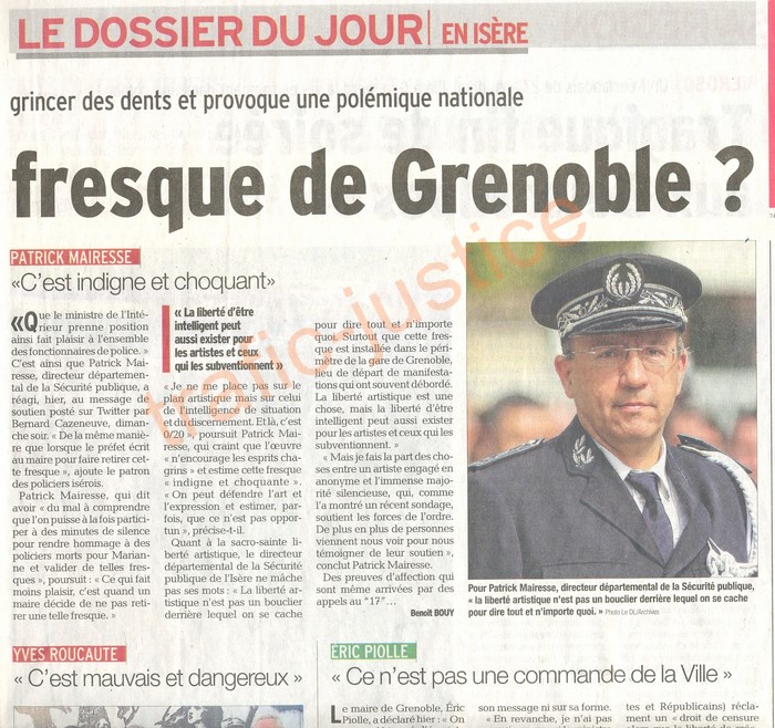 Que le ministre de l'Intérieur prenne position ainsi fait plaisir à l'ensemble des fonctionnaires de police. » C'est ainsi que Patrick Mairesse, directeur départemental de la Sécurité publique, a réagi, hier, au message de soutien posté sur Twitter par Bernard Cazeneuve, dimanche soir. « De la même manière que lorsque le préfet écrit au maire pour faire retirer cette fresque », ajoute le patron des policiers isérois. Patrick Mairesse, qui dit avoir « du mal à comprendre que l'on puisse à la fois participer à des minutes de silence pour rendre hommage à des policiers morts pour Marianne et valider de telles fresques », poursuit : « Ce qui fait moins plaisir, c'est quand un maire décide de ne pas retirer une telle fresque. » |