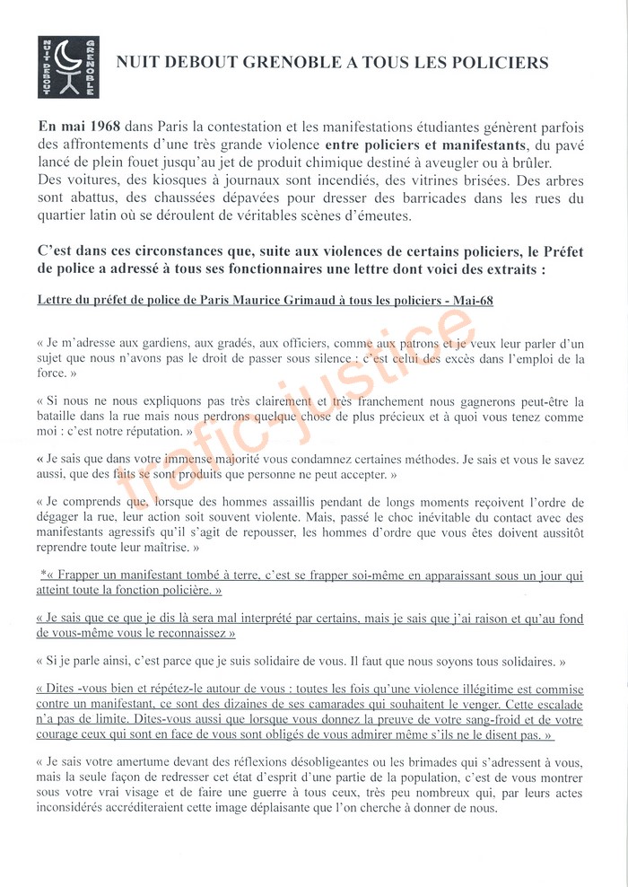 (Recopie du tract ci-dessous) NUIT DEBOUT GRENOBLE A TOUS LES POLICIERS