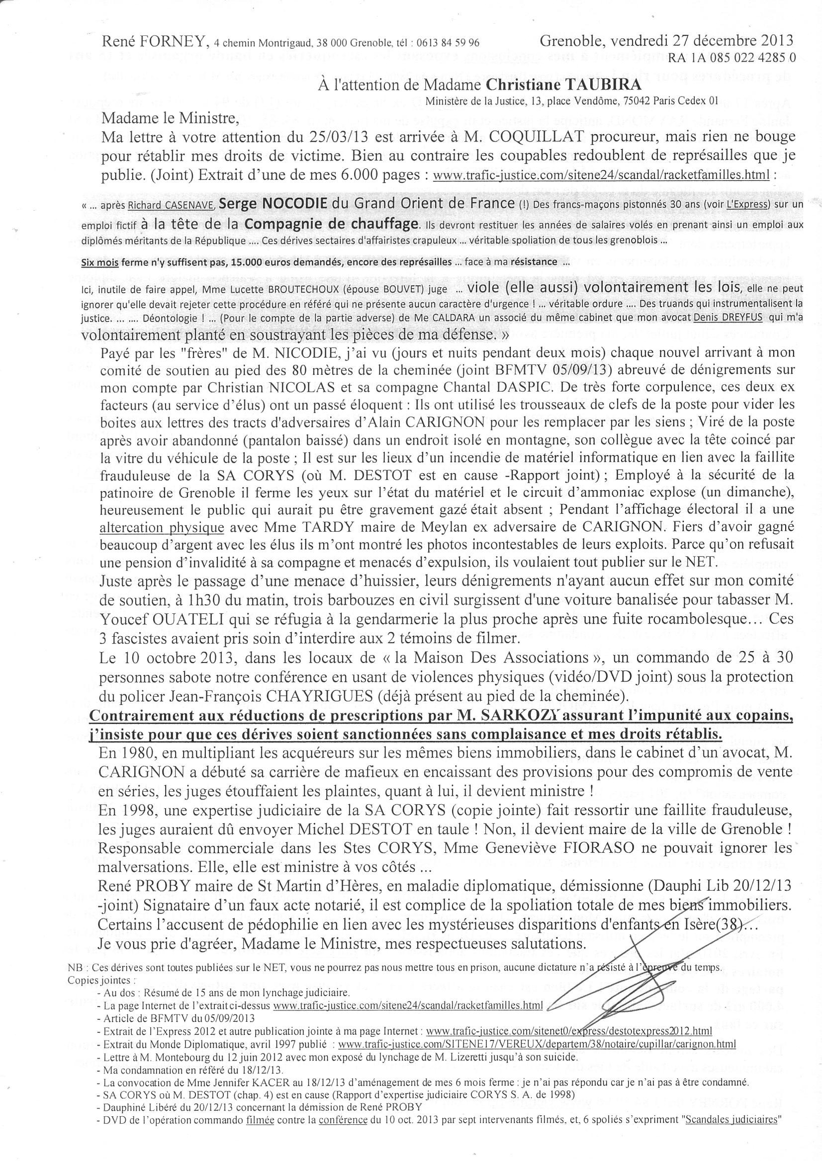 Ma lettre à votre attention du 25/03/13 est arrivée à M. COQUILLAT procureur, mais rien ne bouge pour rétablir mes droits de victime. Bien au contraire les coupables redoublent de représailles que je publie. (Joint) Extrait d'une de mes 6.000 pages :