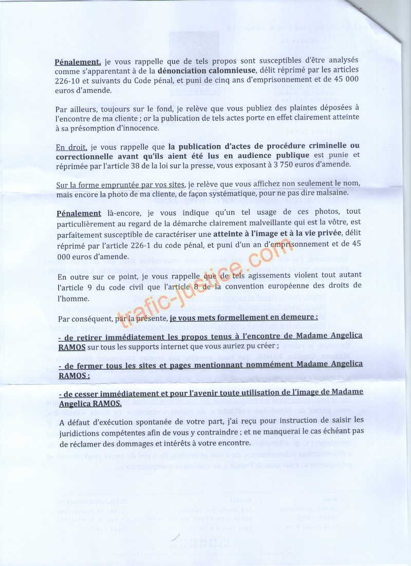 En outre, je relève que lesdites pages mentionnent nommément dans leurs intitulés Madame Angelica RAMOS, que vous associez aux termes hautement dénigrants d' «escroc», d' « arnaques » ou encore de «scandale»; termes que vous associez clairement à ses fonctions d'avocat.