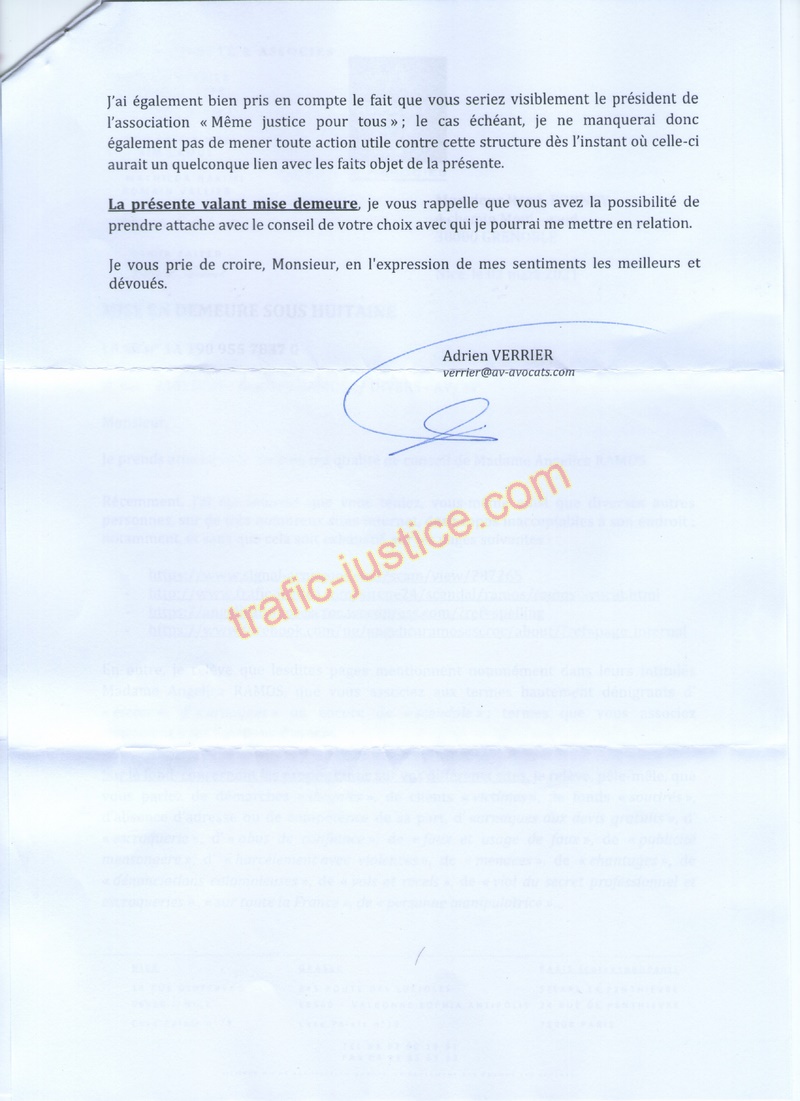 J'ai également bien pris en compte le fait que vous seriez visiblement le président de l'association « Même justice pour tous » ; le cas échéant, je ne manquerai donc également pas de mener toute action utile contre cette structure dès l'instant où celle-ci aurait un quelconque lien avec les faits objet de la présente.
