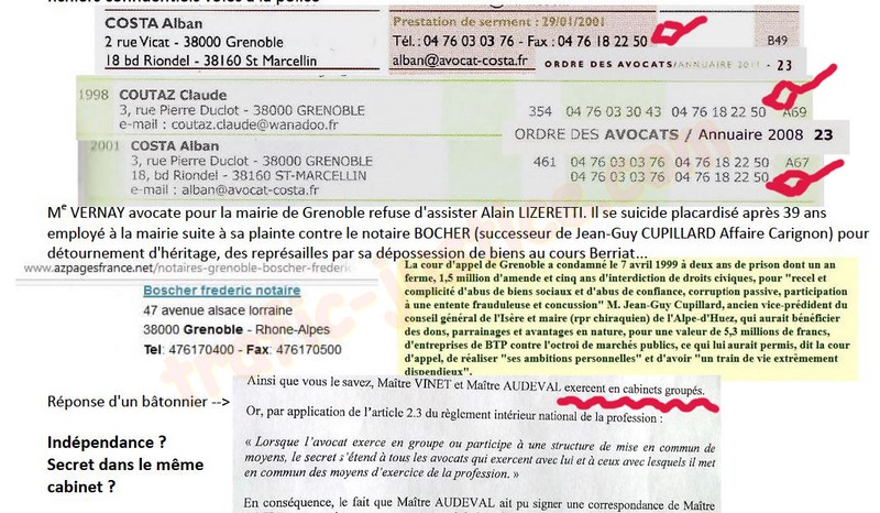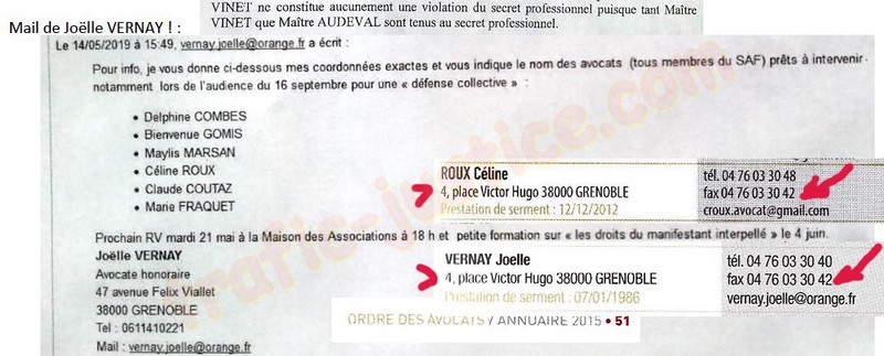 Ci-dessous une compilation d'extraits : d'annuaires d'avocats à plusieurs dates, du jugement du notaire Jean-Guy CUPILLARD, d'une lettre d'un bâtonnier sur le secret entre avocats dans le même cabinet, et, le mail de Joëlle VERNAY pour aider les Gilets Jaunes dans un collectif anti-répressions policières alors que des avocats passés dans son cabinet ont eu un comportement très particulier avec la police !