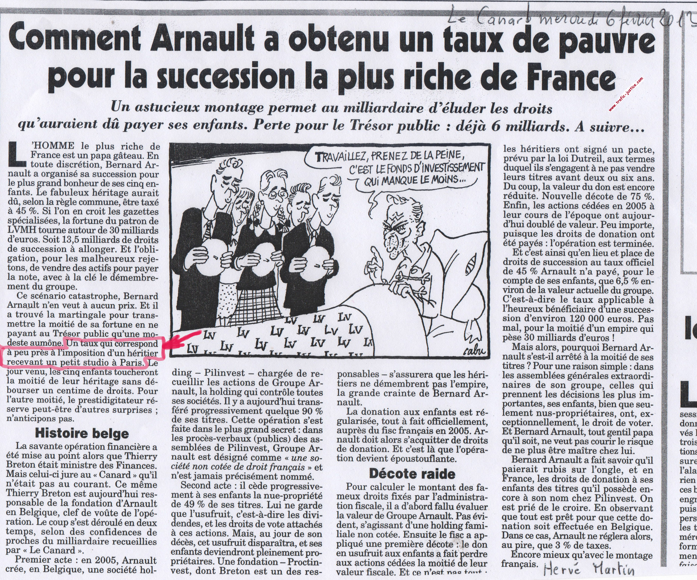 Comment Arnault a obtenu un taux de pauvre pour la succession la plus riche de France Un astucieux montage permet au milliardaire d éluder les droits qu auraient dû payer ses enfants. Perte pour le Trésor public : déjà d milliards. A suivre... |