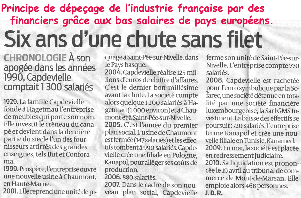 2004. Capdevielle réalise 125 millions d'euros de chiffre d'affaires. C'est le dernier bon millésime avant la chute. La société compte alors quelque 1200 salariés à Hagetmau (1000 environ) et à Chaumont et à Saint-Pée-sur-Nivelle.