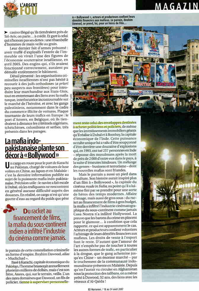 casino illégal qu'ils tiendraient près de Tel-Aviv, on parie... à crédit. Et gare à celui qui n'honore pas ses dettes : une ribambelle d'hommes de main veille au grain. Leur dernier fait d'armes présumé : avoir truffé d'explosifs l'entrée de l'immeuble où vivait l'une des figures de l'économie souterraine israélienne, en avril 2005. Des engins qui, s'ils avaient fonctionné correctement, auraient pu démolir entièrement le bâtiment. Détail pimenté : les organisations criminelles israéliennes n'ont pas hésité à recourir à des juifs orthodoxes (a priori peu suspects aux frontières) pour introduire leur marchandise aux Etats-Unis, tout en entretenant des liens avec la mafia turque, interlocutrice incontournable sur le marché de l'héroïne, et avec les gangs palestiniens, notamment dans le cadre du commerce illicite de voitures. Plaque tournante de leurs trafics en Europe : le port d'Anvers, en Belgique, où ils tiendraient à distance les criminels nigérians, tchétchènes, colombiens et serbes, très présents dans les parages. La mafia indo-pakistanaise plante son décor à « Bollywood» Un cargo en route pour le port de Karachi au Pakistan, chargé de voitures de luxe volées en Chine, au Japon et en Malaisie : c'est la dernière information publiée au sujet de la puissante mafia indo-pakistanaise. Précision utile : le navire a fait escale à Dubaï, où les trafiquants ne rencontrent en général aucune difficulté auprès des douanes. En réalité, ce cargo n'est qu'une goutte d'eau au regard du poids que pèse |
