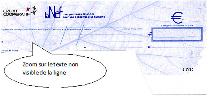 La qualité d'impression médiocre de ce chèque ne permet pas la lisibilité de caractères de taille de 0,5 millimètres