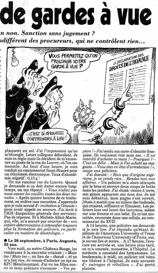 J'ai tendu ma carte d'identité française. Ils voulaient voir mon sac. « Il est interdit d'acheter ce maïs ! -Pourquoi ? - J'ai discuté : « Bien que d'origine nigériane, je ne vends rien... Rendez-moi mes affaires. » Un policier m'a alors attrapée par le bras et envoyé deux coups de botte dans les jambes. J'ai chuté, ventre à terre, son genou appuyant sur mon dos. Je me suis débattue, mon pagne s'est ouvert, j'étais à moitié nue au milieu des badauds, qui criaient, sifflaient et filmaient. Les policiers leur ont lancé des lacrymos, même sur une femme et son bébé. Ils m'ont menottée, emmenée dans une cellule, au commissariat du XVIIe. A 14 heures, une policière me demande si je sais lire. J'ai répondu qu'étant diplômée de l'American University of Texas et de l'American University of Paris, oui, je savais lire et écrire... A 17 heures, l'avocate est arrivée et, une heure plus tard, on m'a amenée, menottée, à l'hôpital. Le médecin a constaté des hématomes. Le lendemain, à midi, un policier est venu me libérer à l'hôpital. Je suis accusée d'« outrages et rébellion ». J'ai porté plainte. |