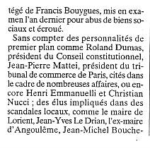 Sans compter des personnalités de premier plan comme Roland Dumas, président du Conseil constitutionnel, Jean-Pierre Mattei, président du tribunal de commerce de Paris, cités dans le cadre de nombreuses affaires, ou encore Henri Emmanuelli et Christian Nucci; des élus impliqués dans des scandales locaux, comme le maire de Lorient, Jean-Yves Le Drian, l'ex-maire d'Angoulême, Jean-Michel Bouche- |