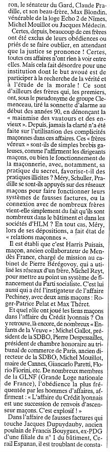 Et quel rôle ont joué les liens maçons dans l'affaire du Crédit lyonnais? On y retrouve, là encore, de nombreux «Enfants de la Veuve»: Michel Gallot, président de la SDBO, Pierre Despessailles, président de chambre honoraire au tribunal de commerce de Paris, ancien directeur de la SDBO, Michel Mouillot, maire de Cannes, Giancarlo Paretti, Florio Fiorini, etc. De nombreux membres de la GLNF (Grande Loge nationale de France), l'obédience la plus fréquentée par les hommes d'affaires, affirment: «L'affaire du Crédit lyonnais est une succession de renvois d'ascenseur maçons. C'est explosif!»
