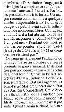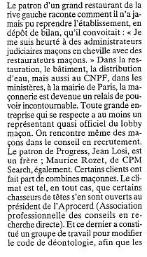 | Texte recopié Le patron d'un grand restaurant de la rive gauche raconte comment il n'a jamais pu reprendre l'établissement, en dépôt de bilan, qu'il convoitait: «Je me suis heurté à des administrateurs judiciaires maçons en cheville avec des restaurateurs maçons.» Dans la restauration, le bâtiment, la distribution d'eau, mais aussi au CNPF, dans les ministères, à la mairie de Paris, la maçonnerie est devenue un relais de pouvoir incontournable. Toute grande entreprise qui se respecte a au moins un représentant quasi officiel du lobby maçon . On rencontre même des maçons dans le conseil en recrutement. Le patron de Progress, Jean Losi, est un frère; Maurice Rozet, de CPM Search, également. Certains clients ont fait part de combines maçonnes. Le climat est tel, en tout cas, que certains chasseurs de têtes s'en sont ouverts au président de l'Aprocerd (Association professionnelle des conseils en recherche directe). Et ce dernier a constitué un groupe de travail pour modifier le code de déontologie, afin que les |