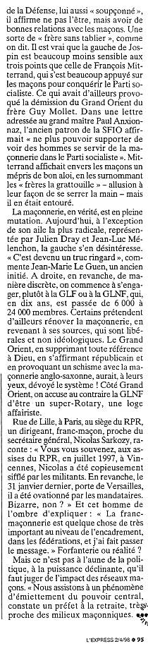 de la Défense, lui aussi «soupçonné», il affirme ne pas l'être, mais avoir de bonnes relations avec les maçons. Une sorte de «frère sans tablier», comme on dit. Il est vrai que la gauche de Jospin est beaucoup moins sensible aux trois points que celle de François Mitterrand, qui s'est beaucoup appuyé sur les maçons pour conquérir le Parti socialiste. Ce qui avait d'ailleurs provoqué la démission du Grand Orient du frère Guy Mollet. Dans une lettre adressée au grand maître Paul Anxionnaz, l'ancien patron de la SFIO affirmait «ne plus pouvoir supporter de voir des hommes se servir de la maçonnerie dans le Parti socialiste». Mitterrand affichait envers les maçons un mépris de bon aloi, en les surnommant les «frères la grattouille» - allusion à leur façon de se serrer la main - mais il en était entouré. |