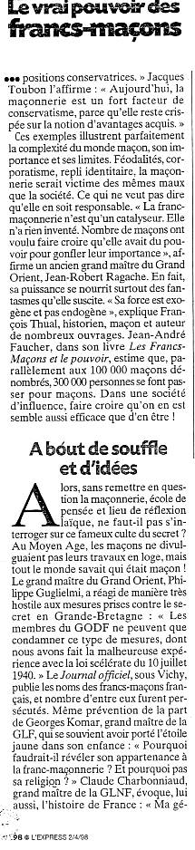 positions conservatrices.» Jacques Toubon l'affirme: « Aujourd'hui, la maçonnerie est un fort facteur de conservatisme, parce qu'elle reste crispée sur la notion d'avantages acquis.»