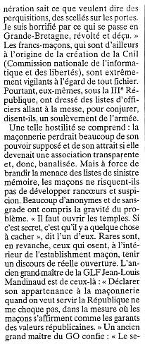 nération sait ce que veulent dire des perquisitions, des scellés sur les portes. Je suis horrifié par ce qui se passe en Grande-Bretagne, révolté et déçu.» Les francs-maçons, qui sont d'ailleurs à l'origine de la création de la Cnil (Commission nationale de l'informatique et des libertés), sont extrêmement vigilants à l'égard de tout fichier. Pourtant, eux-mêmes, sous la IIIe République, ont dressé des listes d'officiers allant à la messe, pour conjurer, disent-ils, un soulèvement de l'armée.