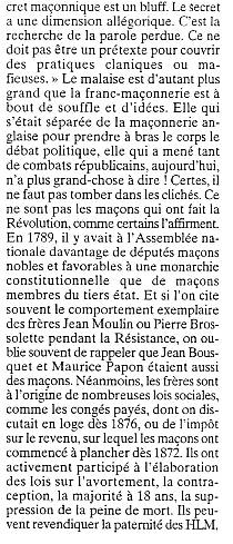 cret maçonnique est un bluff. Le secret a une dimension allégorique. C'est la recherche de la parole perdue. Ce ne doit pas être un prétexte pour couvrir des pratiques claniques ou mafieuses.» Le malaise est d'autant plus grand que la franc-maçonnerie est à bout de souffle et d'idées. Elle qui s'était séparée de la maçonnerie anglaise pour prendre à bras le corps le débat politique, elle qui a mené tant de combats républicains, aujourd'hui, n'a plus grand-chose à dire! Certes, il ne faut pas tomber dans les clichés. Ce ne sont pas les maçons qui ont fait la Révolution, comme certains l'affirment. En 1789, il y avait à l'Assemblée nationale davantage de députés maçons nobles et favorables à une monarchie constitutionnelle que de maçons membres du tiers état. Et si l'on cite souvent le comportement exemplaire des frères Jean Moulin ou Pierre Brossolette pendant la Résistance, on oublie souvent de rappeler que Jean Bousquet et Maurice Papon étaient aussi des maçons. Néanmoins, les frères sont à l'origine de nombreuses lois sociales, comme les congés payés, dont on discutait en loge dès 1876, ou de l'impôt sur le revenu, sur lequel les maçons ont commencé à plancher dès 1872. Ils ont activement participé à l'élaboration des lois sur l'avortement, la contraception, la majorité à 18 ans, la suppression de la peine de mort. Ils peuvent revendiquer la paternité des HLM, |