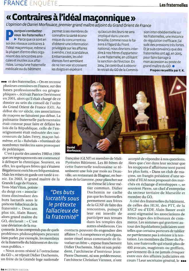 L'opignon de Daniel Morfouace... fraternelles...réseaux contraires à l'idéal maçonnique...permet à ses membres de connaître la santé économique du concurrent ... embrouille... " Des buts lucratifs sous le prétexte fallacieux de la fraternité "