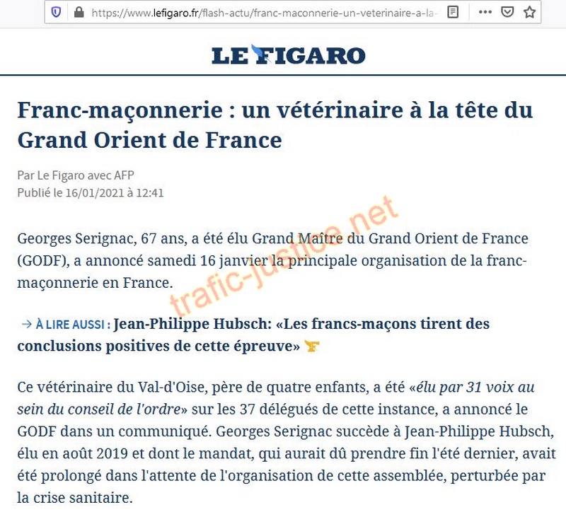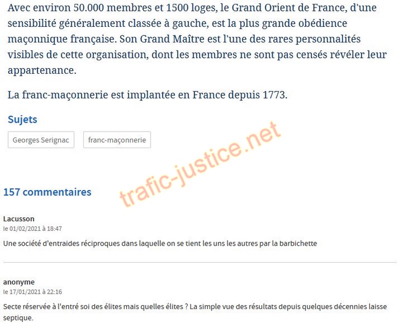 Franc-maçonnerie : un vétérinaire à la tête du Grand Orient de France Par Le Figaro avec AFP Publié le 16/01/2021 à 12:41 Georges Serignac, 67 ans, a été élu Grand Maître du Grand Orient de France (GODF), a annoncé samedi 16 janvier la principale organisation de la franc-maçonnerie en France. Avec environ 50.000 membres et 1500 loges, le Grand Orient de France, d'une sensibilité généralement classée à gauche, est la plus grande obédience maçonnique française. Son Grand Maître est l'une des rares personnalités visibles de cette organisation, dont les membres ne sont pas censés révéler leur appartenance. Sujets Georges Serignac franc-maçonnerie 157 commentaires anonyme le 17/01/2021 à 22:16 En_tendeur le 17/01/2021 à 18:00 |