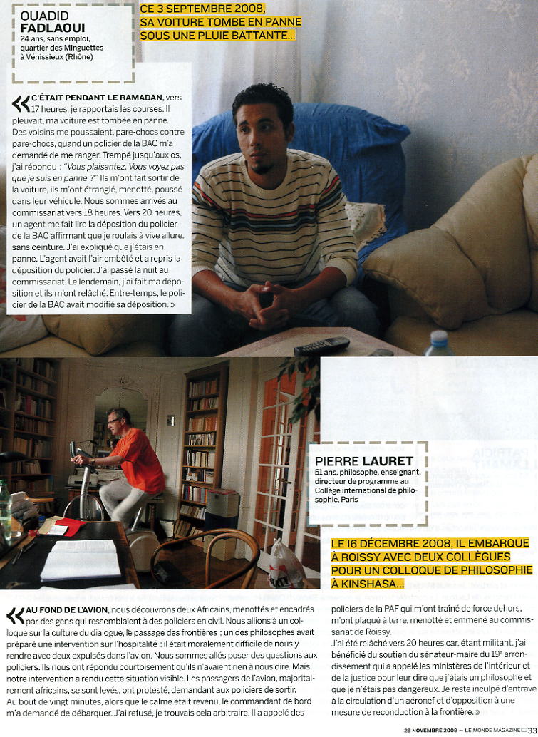 policiers de la PAF qui m'ont traîné de force dehors, m'ont plaqué à terre, menotté et emmené au commissariat de Roissy. J'ai été relâché vers 20 heures car, étant militant, j'ai bénéficié du soutien du sénateur-maire du 19e arrondissement qui a appelé les ministères de l'intérieur et de la justice pour leur dire que j'étais un philosophe et que je n'étais pas dangereux. Je reste inculpé d'entrave à la circulation d'un aéronef et d'opposition à une mesure de reconduction à la frontière.» |