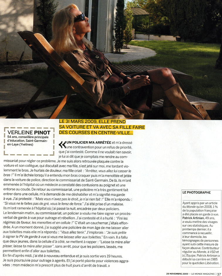 LE PHOTOGRAPHE Ayant appris par un article du Monde qu'en 2008,1% de la population française a été placée en garde à vue, Patrick Artinian, 49 ans, a voulu mettre des visages sur ces statistiques. Au printemps dernier, il a commencé à recueillir, à leur domicile, les témoignages de personnes ayant subi cette mesure de façon abusive. Contributeur régulier au Monde, à VSD et à L'Equipe, Patrick Artinian a débuté sa carrière en 1985 pour le quotidien Libération. |