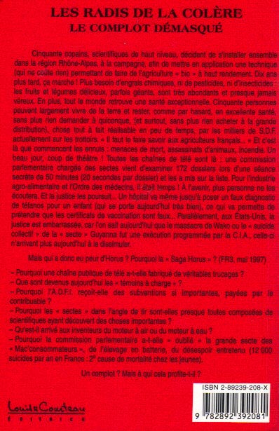 les fruits et légumes délicieux, parfois géants, sont très abondants et presque jamais véreux. En plus, tout le monde retrouve une santé exceptionnelle. Cinquante personnes peuvent largement vivre de la terre et rester, comme par hasard, en excellente santé, sans plus rien demander à quiconque, (et surtout, sans plus rien acheter à la grande distribution), chose tout à fait réalisable en peu de temps, par les milliers de S.D.F. actuellement sur les trottoirs. « Il faut le faire savoir aux agriculteurs français... » Et c'est là que commencent les ennuis : menaces de mort, assassinats d'animaux, incendie. Un beau jour, coup de théâtre ! Toutes les chaînes de télé sont là : une commission parlementaire chargée des sectes vient d'examiner 172 dossiers lors d'une séance secrète de 50 minutes (20 secondes par dossier) et les a , mis sur la liste. Pour l'industrie agro-alimentaire et l'Ordre des médecins, il était temps ! A l'avenir, plus personne ne les écoutera. Et la justice les poursuit... Un hôpital va même jusqu'à poser un faux diagnostic de tétanos pour un enfant (qui se porte aujourd'hui très bien), ce qui va permette de prétendre que les certificats de vaccination sont faux... Parallèlement, aux Etats-Unis, la justice est embarrassée, car l'on sait aujourd'hui que le massacre de Wako ou le « suicide collectif » de la « secte » Guyanna fut une exécution programmée par la C.I.A., celle-ci n'arrivant plus aujourd'hui à le dissimuler.