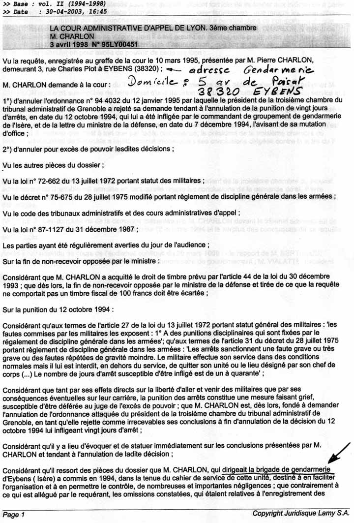 | Condamnation du responsable de la gendarmerie d'Eybens, CHARLON Pierre, à 20 jours d'arrêt. (Demeurant au 5 av. de Poisat - 38320 Eybens) - Récidive : Abus de pouvoir avec l'huissier ROBERT Christian | |