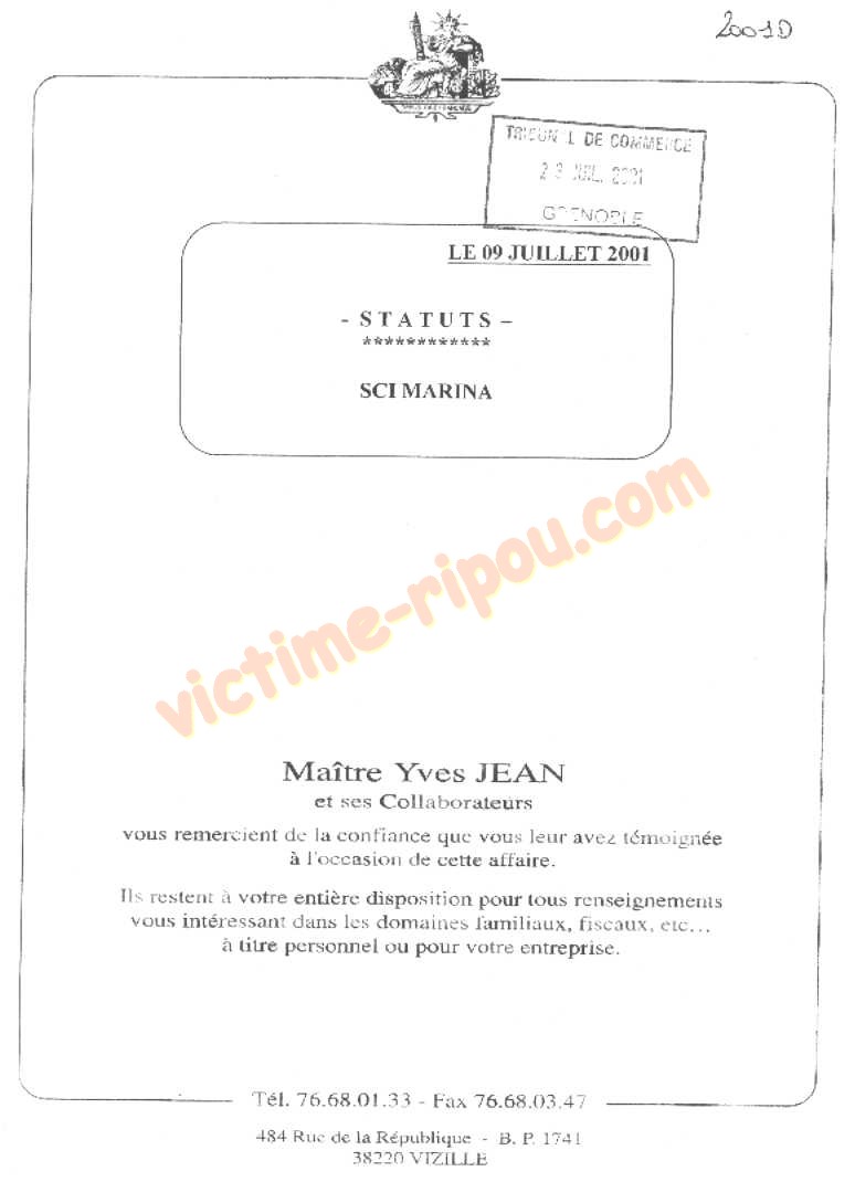 Domicile et Sté du commissaire de police CWIKOWSKI Bruno révoqué . Statuts créés chez un notaire condamné Yves-Jean à 38220 Vizille