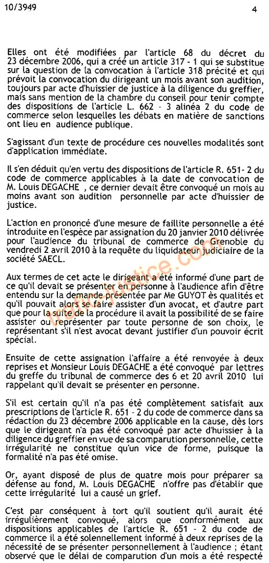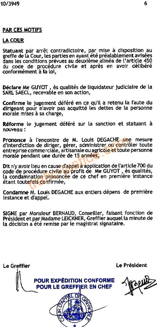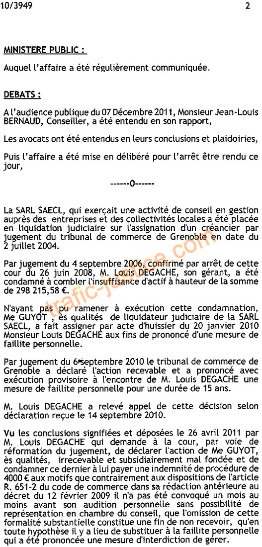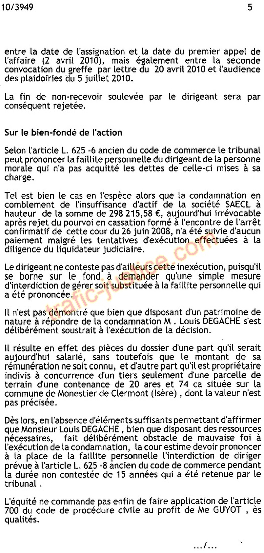 Par jugement du 8 septembre 2010 le tribunal de commerce de Grenoble a déclaré l'action recevable et a prononcé avec exécution provisoire à l'encontre de M. Louis DEGACHE une mesure de faillite personnelle pour une durée de 15 ans.