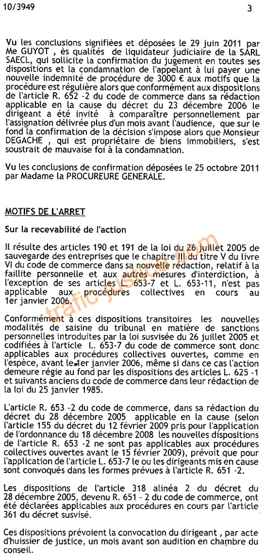 Vu les conclusions signifiées et déposées le 29 juin 2011 par Me GUYOT , ès qualités de liquidateur judiciaire de la SARL SAECL, qui sollicite la confirmation du jugement en toutes ses dispositions et ta condamnation de l'appelant à lui payer une nouvelle indemnité de procédure de 3000 € aux motifs que ta procédure est régulière alors que conformément aux dispositions de l'article R. 652 -2 du code de commerce dans sa rédaction applicable en ta cause du décret du 23 décembre 2006 le dirigeant a été invité à comparaître personnellement par l'assignation délivrée plus d'un mois avant l'audience, que sur le fond la confirmation de la décision s'impose alors que Monsieur DEGACHE , qui est propriétaire de biens immobiliers, s'est soustrait de mauvaise foi à ta condamnation.