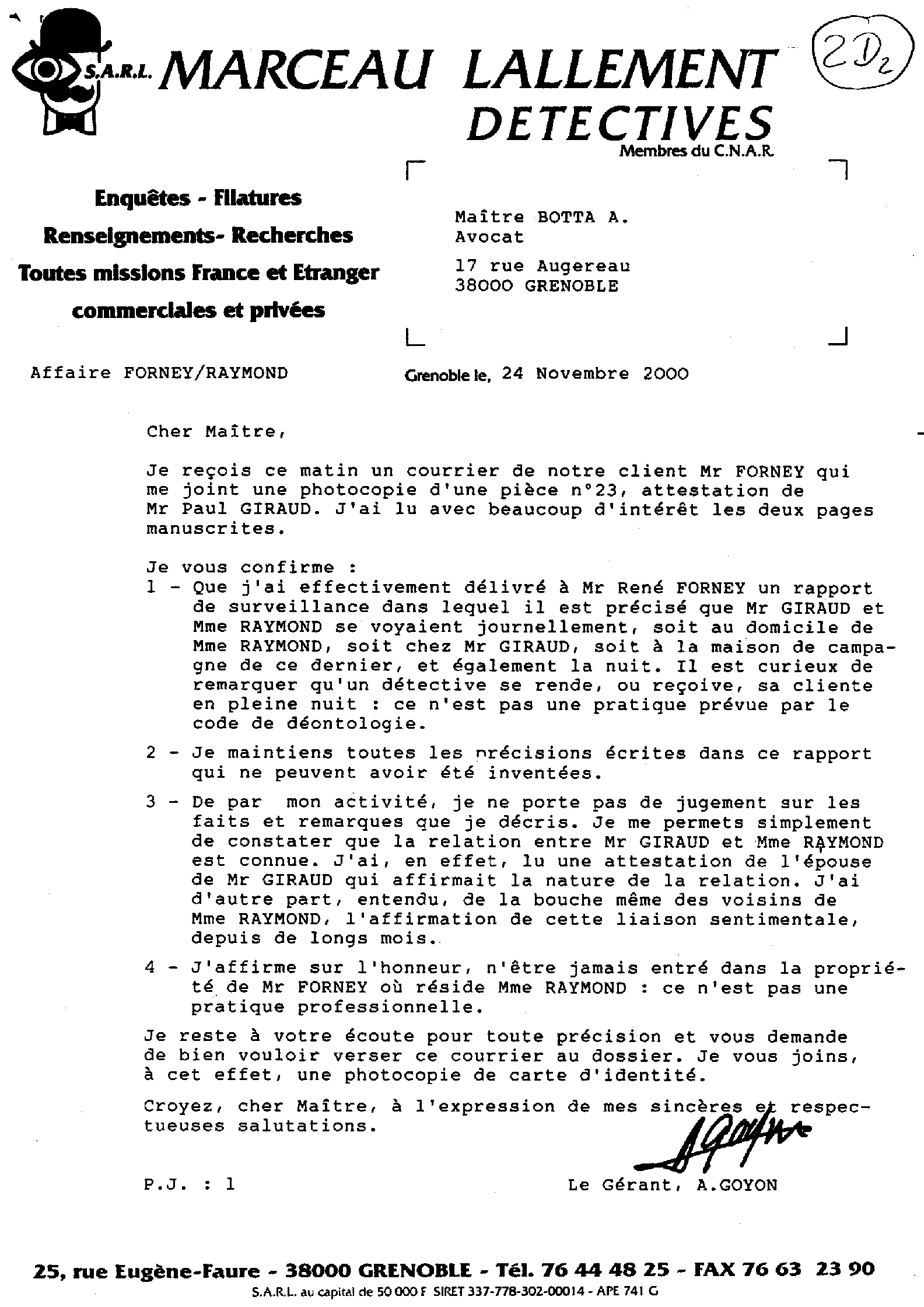 L'amant GIRAUD Paul est l'organisateur du divorce truqué associé à des escrocs ! On peut lire sur ce témoignage : " ... Il est précisé que Mr GIRAUD et Mme RAYMOND se voyaient journellement, soit au domicile de Mme RAYMOND, soit chez M GIRAUD, soit à la maison de campagne de ce dernier, et également la nuit. Il est curieux..." |