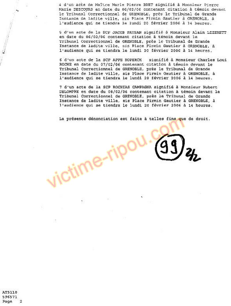 Tous ces témoins, venus à Grenoble (dont certains depuis Paris) étaient présents à l'audience du 20 février 2006 suite à ma citation en correctionnelle par M FONTAINE LUC. Le juge Pradier Jean-Pierre a reporté l'audience à une date indéterminée ! Les explications (pour cette pièce) |