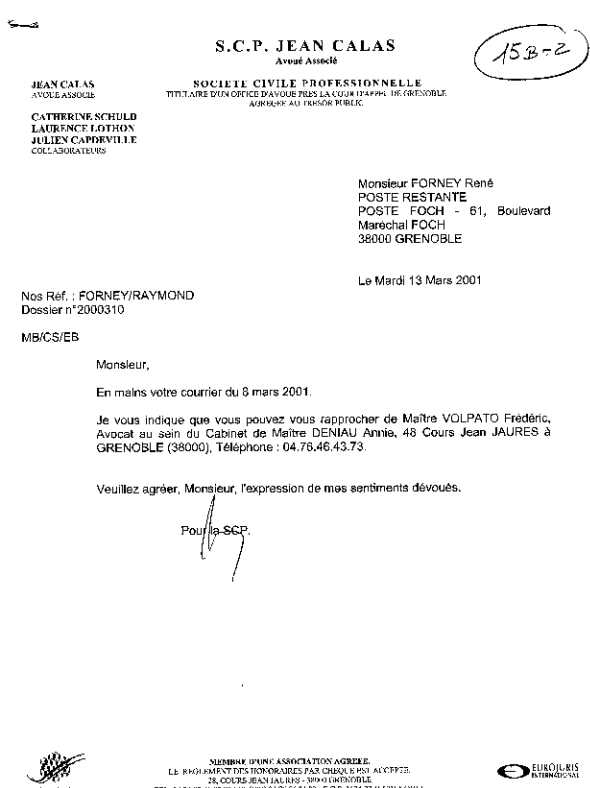 | Jean CALAS , l'avoué lui reste muet, mais il sera vérifié qu'il a entravé la communication de mes pièces essentielles, un véritable truand. Denis DREYFUS prendra la suite de cet avocat stagiaire dont la proximité de l'étage en dessous de CALAS semblait suspecte. |