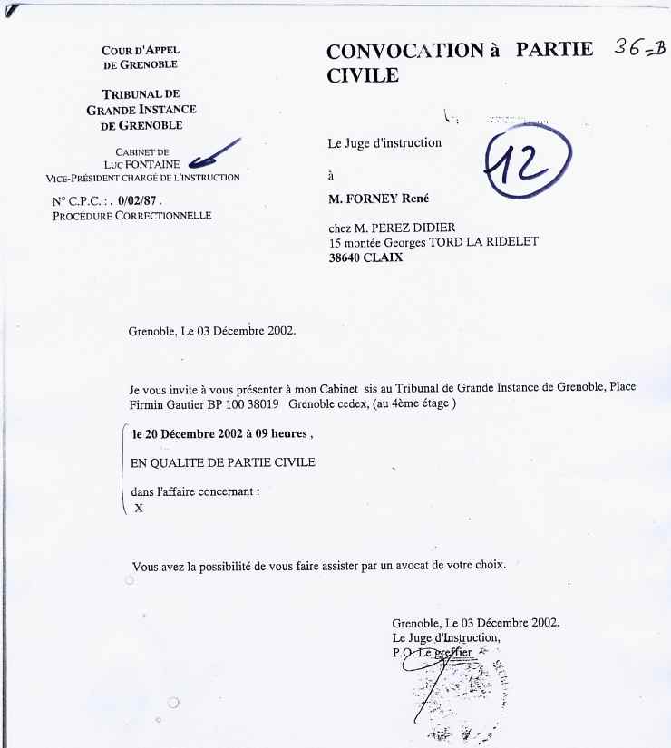 Convocation par le juge M FONTAINE Luc pour une instruction préliminaire ! à savoir si je maintenais ma plainte contre BOTTA AUBERT, qui tente de me dissuader de poursuivre