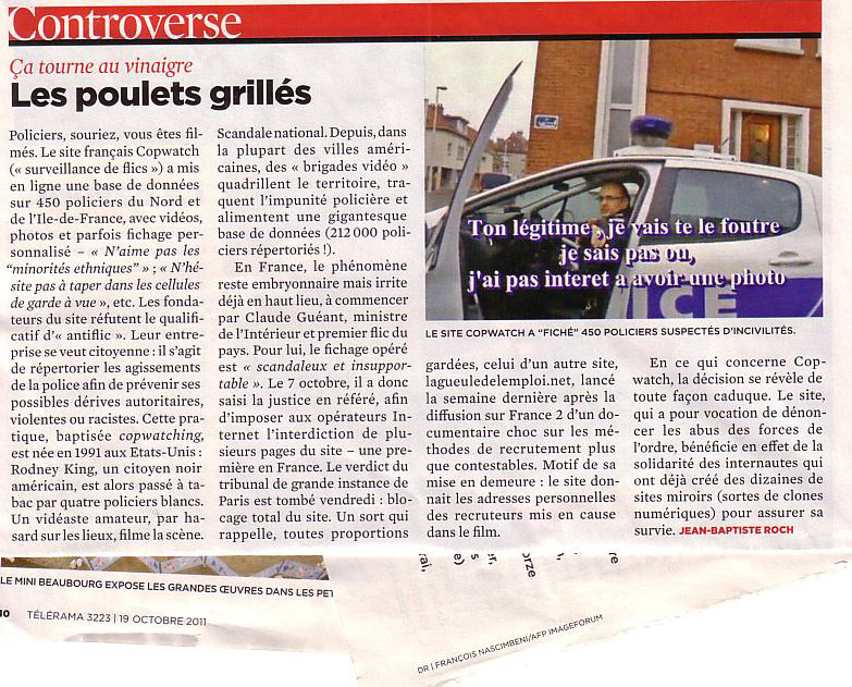 | Policiers, souriez, vous êtes filmés. Le site français Copwatch (« surveillance de flics ») a mis en ligne une base de données sur 450 policiers du Nord et de l'11e-de-France, avec vidéos, photos et parfois fichage personnalisé - « N'aime pas les "minorités ethniques" » ; «N'hésite pas à taper dans les cellules de garde à vue », etc. Les fondateurs du site réfutent le qualificatif d'« antiflic ». Leur entreprise se veut citoyenne : il s'agit de répertorier les agissements de la police afin de prévenir ses possibles dérives autoritaires, violentes ou racistes. Cette pratique, baptisée copwatching, est née en 1991 aux Etats-Unis : Rodney King, un citoyen noir américain, est alors passé à tabac par quatre policiers blancs. Un vidéaste amateur, par hasard sur les lieux, filme la scène. | Scandale national. Depuis, dans la plupart des villes américaines, des « brigades vidéo quadrillent le territoire, traquent l'impunité policière et alimentent une gigantesque base de données (212 000 policiers répertoriés D. En France, le phénomène reste embryonnaire mais irrite déjà en haut lieu, à commencer par Claude Guéant, ministre de l'Intérieur et premier flic du pays. Pour lui, le fichage opéré est « scandaleux et insupportable ». Le 7 octobre, il a donc saisi la justice en référé, afin d'imposer aux opérateurs Internet l'interdiction de plusieurs pages du site - une première en France. Le verdict du tribunal de grande instance de Paris est tombé vendredi : blocage total du site. Un sort qui rappelle, toutes proportions |
