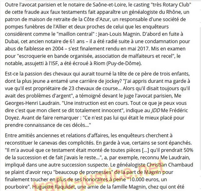 Des antécédants en 1997. Plus de 20 ans de dépossession, et, la justice longue à stopper cette délinquance financiaire de son milieu du droit. Le notaire Magnin un récidiviste en association de malfaiteurs, complicité avocat, directeur de maison de retraite ... - A t-on consulté tous les clients de ce notaire pour identifier les lésés ?