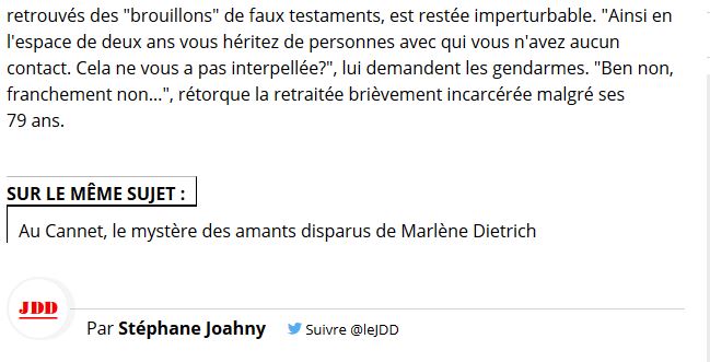 Ce 3 septembre 2015 vers 15 heures, François, chauffeur de taxi à Lapalisse (Allier) se présente, comme convenu la veille, chez Daniel Mazeas, qui vit seul dans une belle demeure entourée d'un parc dans les environs de Servilly. Un coup de klaxon. Rien. François sait le vieil homme dépressif depuis la mort de sa femme. Il s'aventure dans la propriété, ne voit rien, appelle les gendarmes. A ces derniers il dira : "M. Mazeas avait tout préparé pour que ce soit moi qui donne l'alerte car personne d'autre ne le connaissait. Si je n'avais pas donné l'alerte, il serait toujours au bout de sa corde…" Sur la table de la cuisine, une note manuscrite, les dernières volontés du défunt : "Servilly le 28/08/2015, je souhaite être incinéré auprès de mon épouse au crématorium de Vichy…" Mais pas de testament. Missionné par la justice, un huissier vichyssois découvre deux testaments croisés établis en 2000, les époux Mazeas se léguant réciproquement l'ensemble de leurs biens. Mais devant l'absence d'héritier, le maire de Servilly saisit le service des Domaines en succession vacante… Une vaste entreprise frauduleuse Pourtant M. Mazeas a bien désigné un héritier. Un document apparaît en octobre, un mois après sa mort. Un avocat parisien, Me Georges-Henri Laudrain, se manifeste auprès de Me Alain Cauvel, notaire à Chauffailles, en Saône-et-Loire. L'avocat dispose d'une lettre signée du mort, datée du 31 août, qui institue comme légataire universel une "vieille amie" libanaise domiciliée à Chelsea, dans l'ouest de Londres. L'avocat affirme avoir reçu "début septembre" ce testament olographe et demande une procuration à faire signer à la légataire libanaise. Un rendez-vous est fixé le 11 février 2016 chez l'huissier de Vichy. L'entretien se passe mal. L'huissier écrit alors au procureur de la République de Cusset : "Je pense pouvoir émettre des doutes sur l'identité de l'auteur du second testament…" Une information judiciaire est ouverte pour "faux et usage de faux". Les gendarmes de la section de recherches de Clermont-Ferrand sont chargés de l'enquête. Ils ne sont pas au bout de leurs surprises… Dix-huit mois, trois juges d'instruction et sept mises en examen plus tard, l'enquête démasque "une vaste entreprise frauduleuse permettant – après la mort de personnes fortunées et dépourvues et d'héritiers proches – de s'approprier le patrimoine du défunt au détriment de l'Etat ou d'héritiers lointains en faisant 'apparaître' des testaments olographes". Sept successions douteuses, dans toute la France, depuis 2011 ont été mises au jour. Entre les biens immobiliers et les assurances vie, les détournements se chiffrent à plusieurs millions d'euros. En l'espace de deux ans vous héritez de personnes avec qui vous n'avez aucun contact. Cela ne vous a pas interpellée? Outre l'avocat parisien et le notaire de Saône-et-Loire, le casting "très Rotary Club" de cette fraude aux faux testaments fait apparaître un généalogiste du Rhône, un patron de maison de retraite de la Côte d'Azur, un responsable d'une société de pompes funèbres de l'Allier et deux proches de celui que les enquêteurs considèrent comme le "maillon central" : Jean-Louis Magnin. D'abord en fuite à Dubai, cet ancien notaire de 61 ans – il a été radié suite à une condamnation pour abus de faiblesse en 2004 – s'est finalement rendu en mai 2017. Mis en examen pour "escroquerie en bande organisée, association de malfaiteurs et recel", le notable, assujetti à l'ISF, a été écroué à Riom (Puy-de-Dôme). Est-ce la passion des chevaux qui aurait tourné la tête de ce père de trois enfants, dont la plus jeune a entamé une carrière de jockey? "J'ai appris durant ma garde à vue qu'il est propriétaire de 23 chevaux de course… Alors qu'il disait toujours qu'il avait des problèmes d'argent", a témoigné devant le juge l'avocat parisien, Me Georges-Henri Laudrain. "Une instruction est en cours. Tout ce que je peux vous dire c'est que mon client se dit totalement innocent", indique au JDD Me Frédéric Doyez. Avant de faire remarquer : "Ce n'est pas lui qui était le mieux placé pour prendre connaissance de ces décès…" Entre amitiés anciennes et relations d'affaires, les enquêteurs cherchent à reconstituer le canevas des complicités. En garde à vue, certains se sont épanchés. "Il m'a avoué que ce testament était monté de toutes pièces […] qu'il prendrait 50% de la succession et de fait j'avais le reste…", a, par exemple, reconnu Me Laudrain, impliqué dans une autre succession suspecte. Le généalogiste Christian Chambaud se plaint d'avoir reçu "beaucoup de promesses" de la part de Magnin pour finalement toucher en plus de ses honoraires à peine "10.000 euros, un pourboire". Huguette Raquidet, une amie de la famille Magnin, chez qui ont été retrouvés des "brouillons" de faux testaments, est restée imperturbable. "Ainsi en l'espace de deux ans vous héritez de personnes avec qui vous n'avez aucun contact. Cela ne vous a pas interpellée?", lui demandent les gendarmes. "Ben non, franchement non…", rétorque la retraitée brièvement incarcérée malgré ses 79 ans. Sur le même sujet :